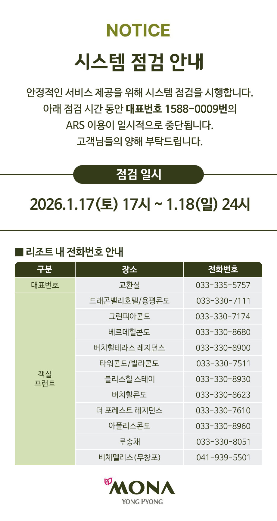 예약센터 전화예약 시스템 점검 안내(1.17 ~1.18 / 17:00~24:00)