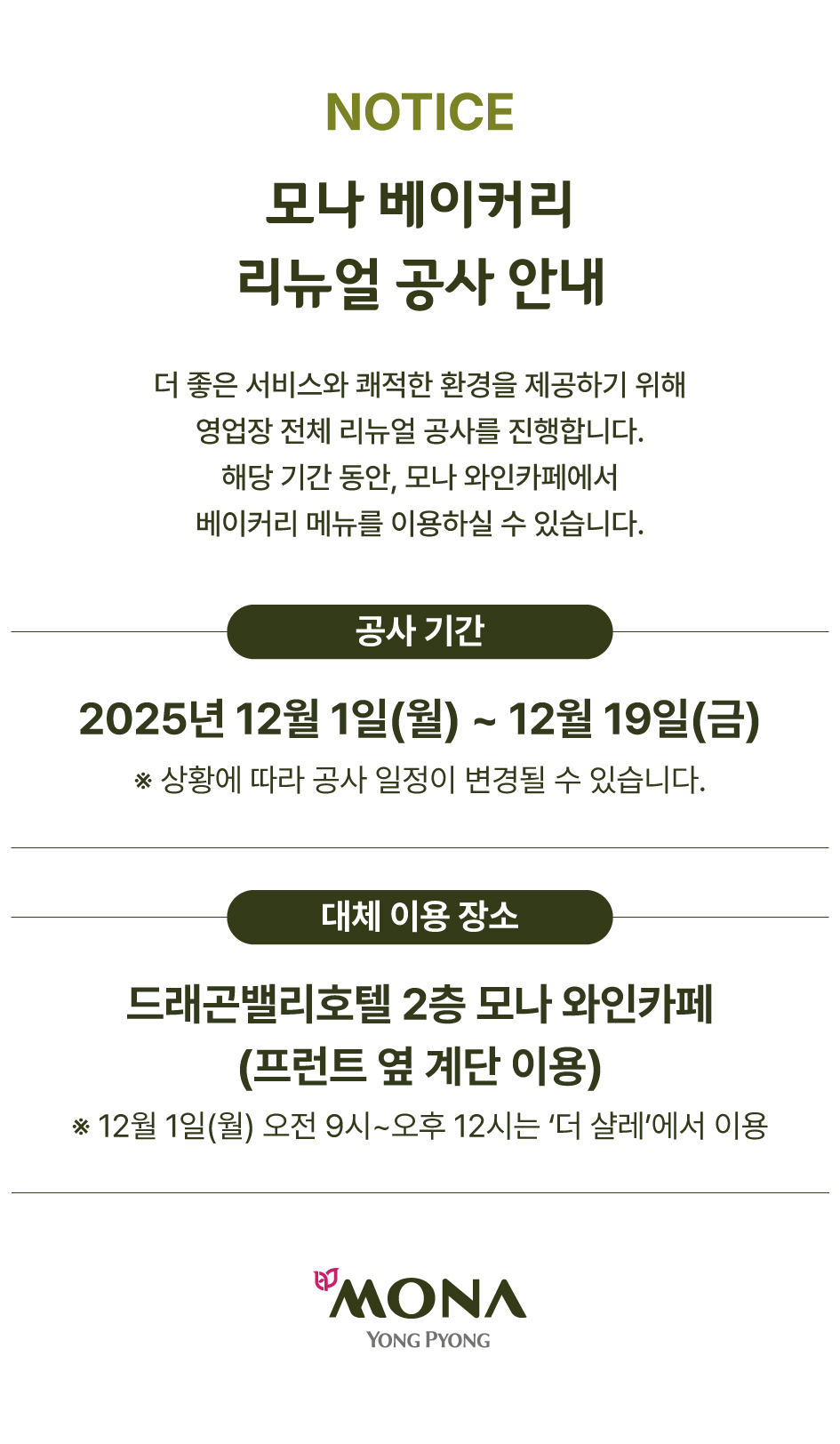 모나 베이커리 리뉴얼 공사 안내(12/1~12/19)
