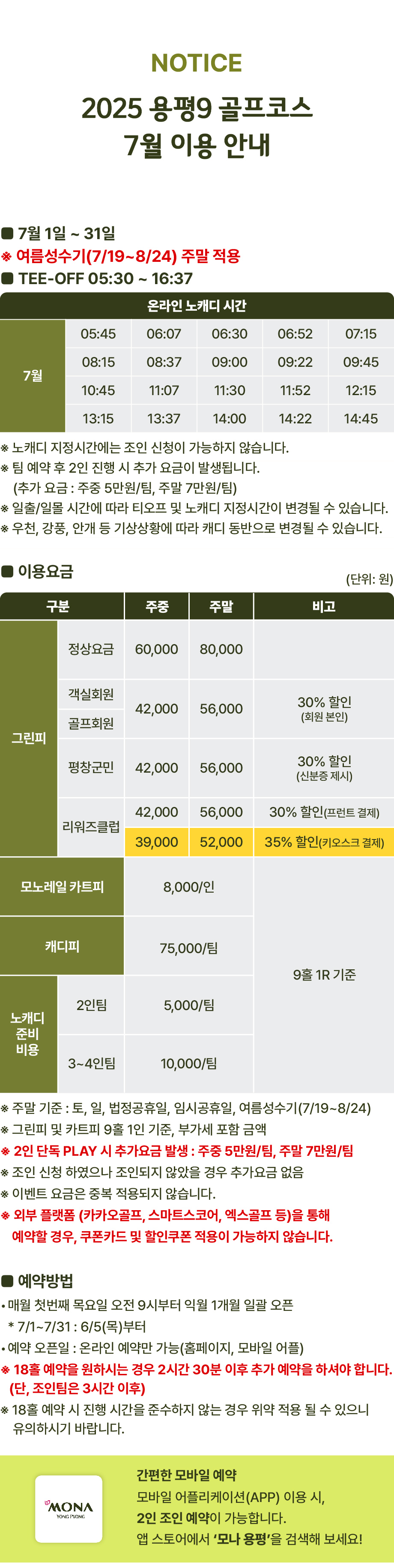 [모나 용평 골프] 2025 용평9 골프코스 7월 이용 안내