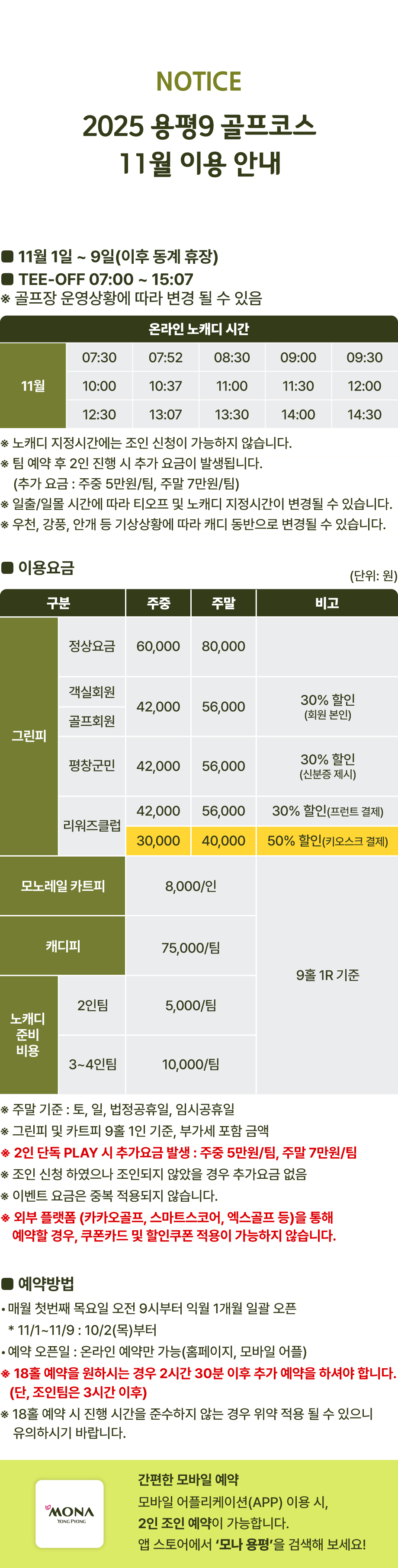 [모나 용평 골프] 2025 용평9 골프코스 11월 이용 안내